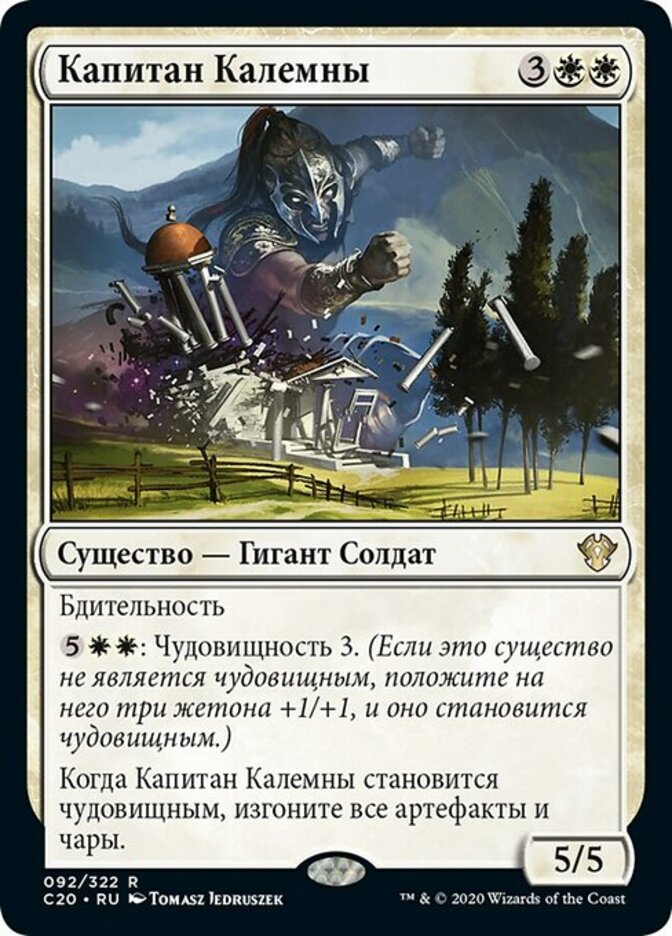 | Rules | Vigilance : Monstrosity 3. (If this creature isn't monstrous, put three +1/+1 counters on it and it becomes monstrous.) When Kalemne's Captain becomes monstrous, exile all artifacts and enchantments. |