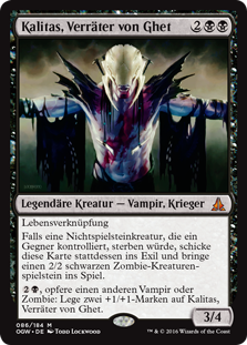 | Rules | Lifelink If a nontoken creature an opponent controls would die, instead exile that card and create a 2/2 black Zombie creature token. , Sacrifice another Vampire or Zombie: Put two +1/+1 counters on Kalitas, Traitor of Ghet. |