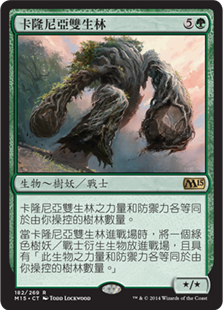 | Rules | Kalonian Twingrove's power and toughness are each equal to the number of Forests you control. When Kalonian Twingrove enters the battlefield, create a green Treefolk Warrior creature token with "This creature's power and toughness are each equal to the number of Forests you control." |