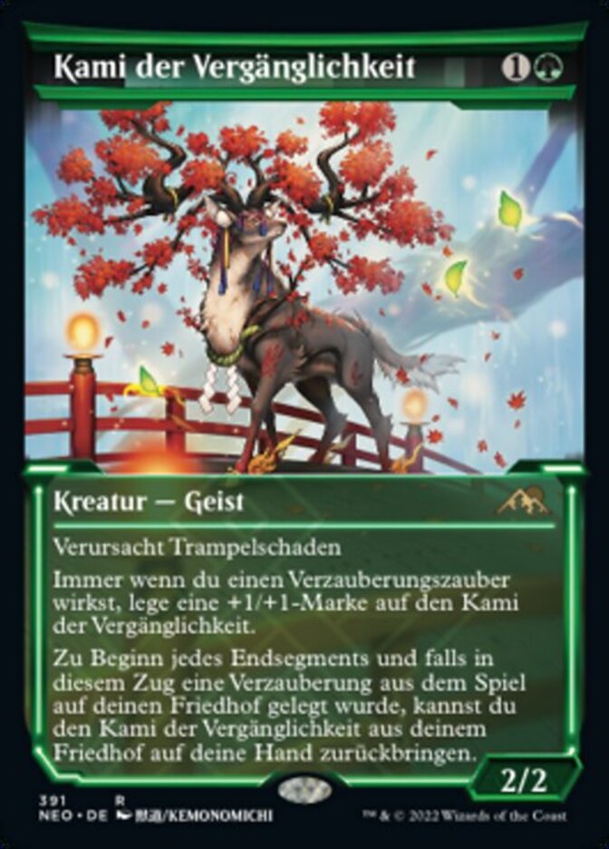 | Rules | Trample Whenever you cast an enchantment spell, put a +1/+1 counter on Kami of Transience. At the beginning of each end step, if an enchantment was put into your graveyard from the battlefield this turn, you may return Kami of Transience from your graveyard to your hand. |