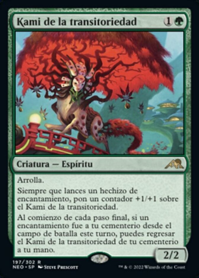 | Rules | Trample Whenever you cast an enchantment spell, put a +1/+1 counter on Kami of Transience. At the beginning of each end step, if an enchantment was put into your graveyard from the battlefield this turn, you may return Kami of Transience from your graveyard to your hand. |
