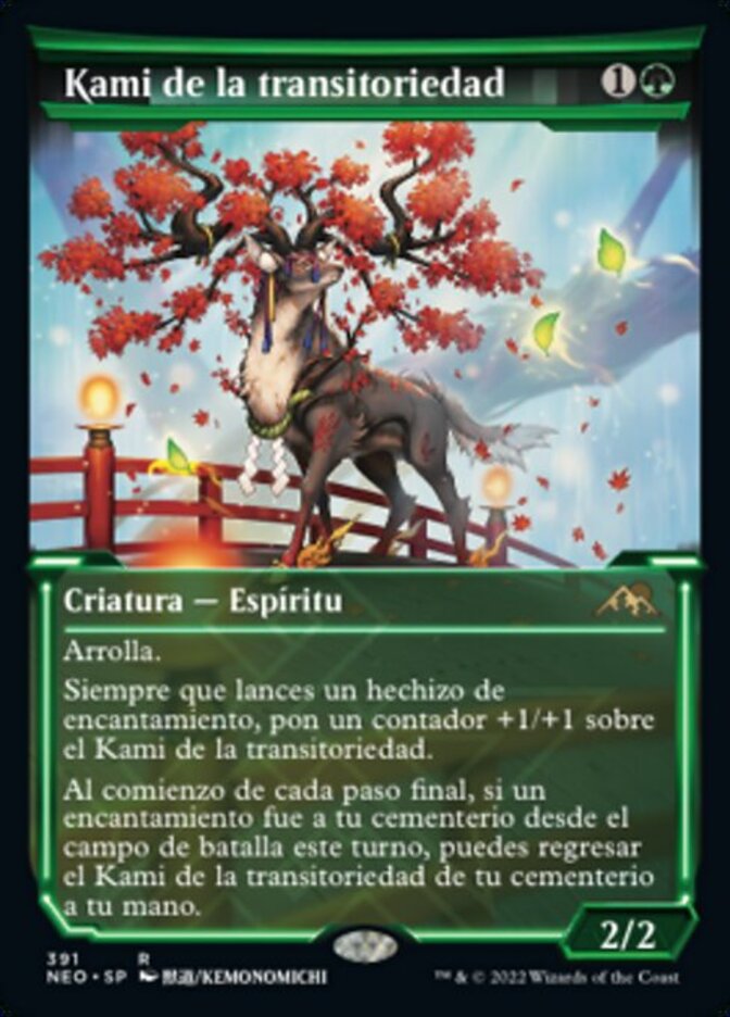 | Rules | Trample Whenever you cast an enchantment spell, put a +1/+1 counter on Kami of Transience. At the beginning of each end step, if an enchantment was put into your graveyard from the battlefield this turn, you may return Kami of Transience from your graveyard to your hand. |
