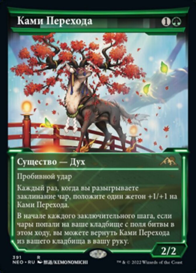 | Rules | Trample Whenever you cast an enchantment spell, put a +1/+1 counter on Kami of Transience. At the beginning of each end step, if an enchantment was put into your graveyard from the battlefield this turn, you may return Kami of Transience from your graveyard to your hand. |