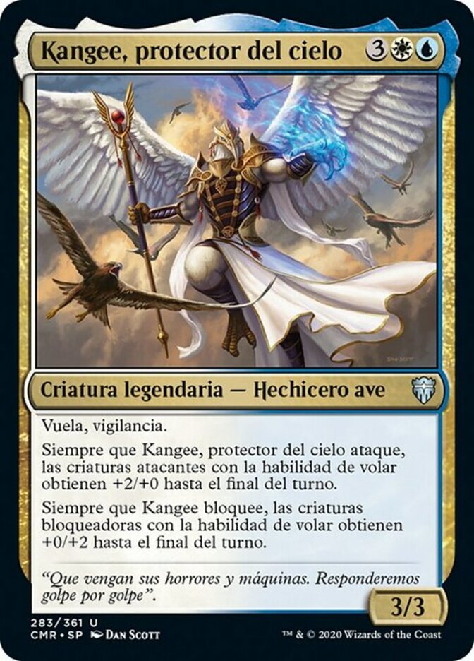 | Rules | Flying, vigilance Whenever Kangee, Sky Warden attacks, attacking creatures with flying get +2/+0 until end of turn. Whenever Kangee blocks, blocking creatures with flying get +0/+2 until end of turn. |