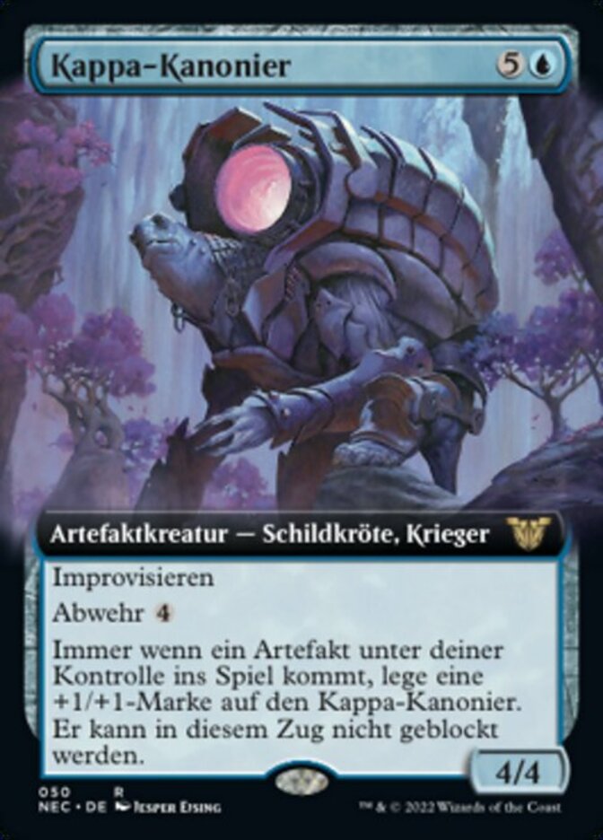 | Rules | Improvise (Your artifacts can help cast this spell. Each artifact you tap after you're done activating mana abilities pays for .) Ward Whenever an artifact enters the battlefield under your control, put a +1/+1 counter on Kappa Cannoneer and it can't be blocked this turn. |