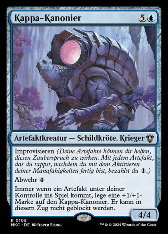 | Rules | Improvise (Your artifacts can help cast this spell. Each artifact you tap after you're done activating mana abilities pays for .) Ward Whenever an artifact enters the battlefield under your control, put a +1/+1 counter on Kappa Cannoneer and it can't be blocked this turn. |