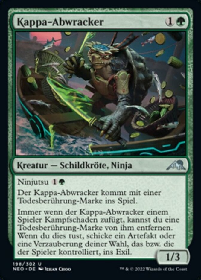 | Rules | Ninjutsu Kappa Tech-Wrecker enters the battlefield with a deathtouch counter on it. Whenever Kappa Tech-Wrecker deals combat damage to a player, you may remove a deathtouch counter from it. When you do, exile target artifact or enchantment that player controls. |