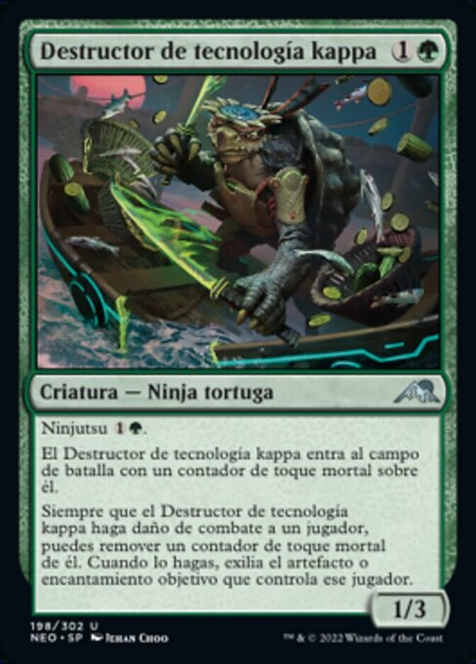 | Rules | Ninjutsu Kappa Tech-Wrecker enters the battlefield with a deathtouch counter on it. Whenever Kappa Tech-Wrecker deals combat damage to a player, you may remove a deathtouch counter from it. When you do, exile target artifact or enchantment that player controls. |