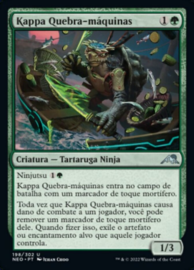 | Rules | Ninjutsu Kappa Tech-Wrecker enters the battlefield with a deathtouch counter on it. Whenever Kappa Tech-Wrecker deals combat damage to a player, you may remove a deathtouch counter from it. When you do, exile target artifact or enchantment that player controls. |
