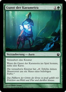 | Rules | Enchant creature When Karametra's Favor enters the battlefield, draw a card. Enchanted creature has ": Add one mana of any color." |
