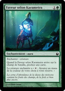 | Rules | Enchant creature When Karametra's Favor enters the battlefield, draw a card. Enchanted creature has ": Add one mana of any color." |