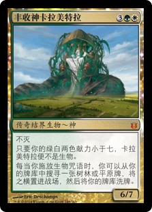 | Rules | Indestructible As long as your devotion to green and white is less than seven, Karametra isn't a creature. Whenever you cast a creature spell, you may search your library for a Forest or Plains card, put it onto the battlefield tapped, then shuffle. |