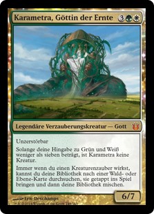 | Rules | Indestructible As long as your devotion to green and white is less than seven, Karametra isn't a creature. Whenever you cast a creature spell, you may search your library for a Forest or Plains card, put it onto the battlefield tapped, then shuffle. |
