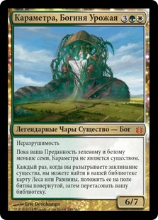 | Rules | Indestructible As long as your devotion to green and white is less than seven, Karametra isn't a creature. Whenever you cast a creature spell, you may search your library for a Forest or Plains card, put it onto the battlefield tapped, then shuffle. |