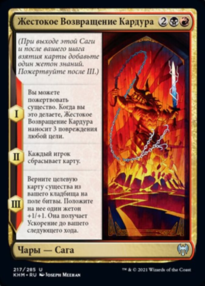 | Rules | (As this Saga enters and after your draw step, add a lore counter. Sacrifice after III.) I — You may sacrifice a creature. When you do, Kardur's Vicious Return deals 3 damage to any target. II — Each player discards a card. III — Return target creature card from your graveyard to the battlefield. Put a +1/+1 counter on it. It gains haste until your next turn. |