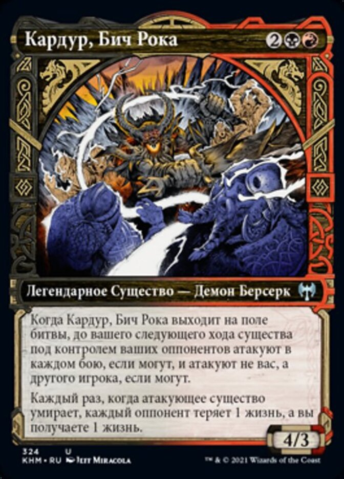 | Rules | When Kardur, Doomscourge enters the battlefield, until your next turn, creatures your opponents control attack each combat if able and attack a player other than you if able. Whenever an attacking creature dies, each opponent loses 1 life and you gain 1 life. |