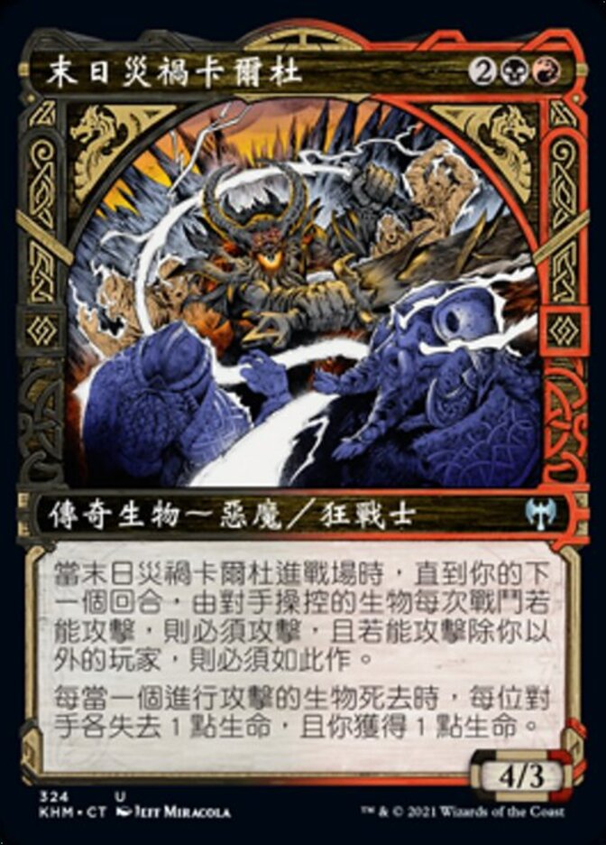 | Rules | When Kardur, Doomscourge enters the battlefield, until your next turn, creatures your opponents control attack each combat if able and attack a player other than you if able. Whenever an attacking creature dies, each opponent loses 1 life and you gain 1 life. |