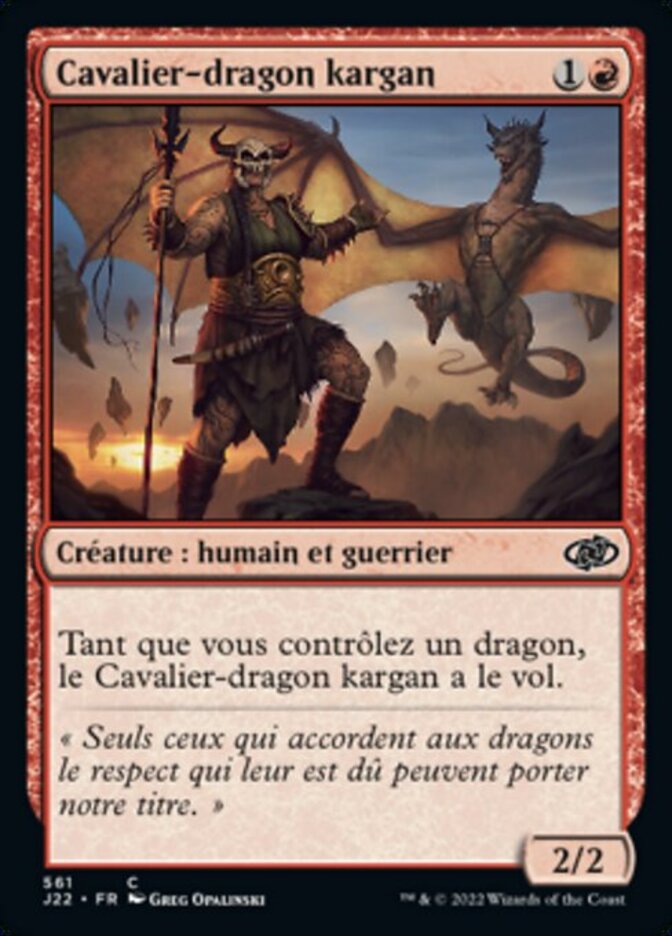 | Rules | As long as you control a Dragon, Kargan Dragonrider has flying. (It can't be blocked except by creatures with flying or reach.) |
