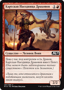 | Rules | As long as you control a Dragon, Kargan Dragonrider has flying. (It can't be blocked except by creatures with flying or reach.) |