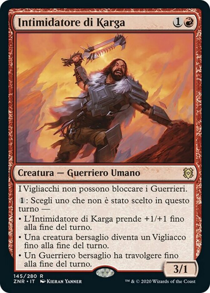 | Rules | Cowards can't block Warriors. : Choose one that hasn't been chosen this turn — • Kargan Intimidator gets +1/+1 until end of turn. • Target creature becomes a Coward until end of turn. • Target Warrior gains trample until end of turn. |