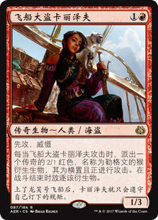 | Rules | First strike, menace Whenever Kari Zev, Skyship Raider attacks, create Ragavan, a legendary 2/1 red Monkey creature token. Ragavan enters the battlefield tapped and attacking. Exile that token at end of combat. |
