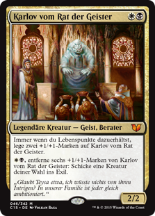 | Rules | Whenever you gain life, put two +1/+1 counters on Karlov of the Ghost Council. , Remove six +1/+1 counters from Karlov of the Ghost Council: Exile target creature. |
