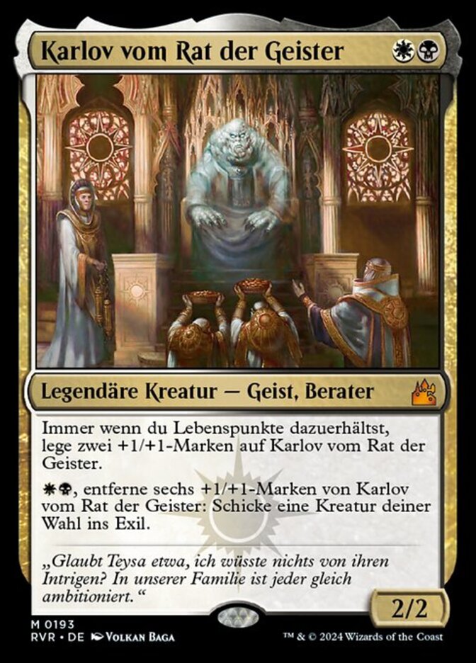 | Rules | Whenever you gain life, put two +1/+1 counters on Karlov of the Ghost Council. , Remove six +1/+1 counters from Karlov of the Ghost Council: Exile target creature. |