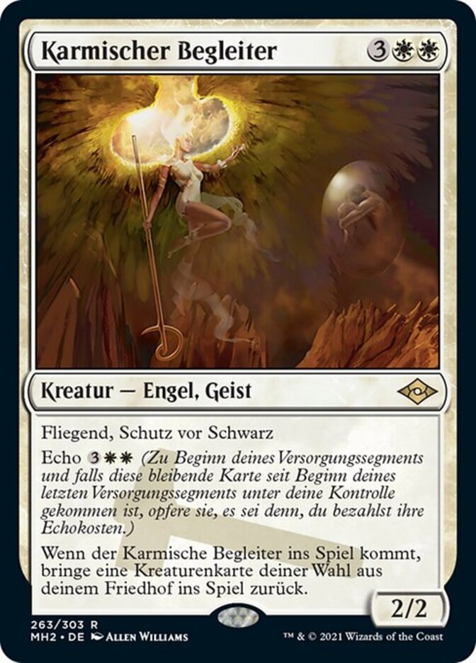 | Rules | Flying, protection from black Echo (At the beginning of your upkeep, if this came under your control since the beginning of your last upkeep, sacrifice it unless you pay its echo cost.) When Karmic Guide enters the battlefield, return target creature card from your graveyard to the battlefield. |