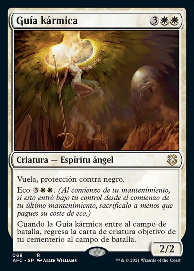 | Rules | Flying, protection from black Echo (At the beginning of your upkeep, if this came under your control since the beginning of your last upkeep, sacrifice it unless you pay its echo cost.) When Karmic Guide enters the battlefield, return target creature card from your graveyard to the battlefield. |