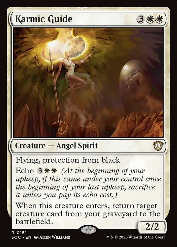 | Rules | Flying, protection from black Echo (At the beginning of your upkeep, if this came under your control since the beginning of your last upkeep, sacrifice it unless you pay its echo cost.) When Karmic Guide enters the battlefield, return target creature card from your graveyard to the battlefield. |