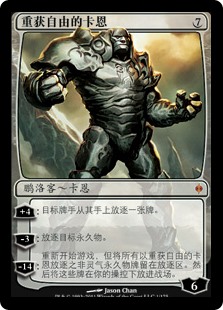 | Rules | +4: Target player exiles a card from their hand. −3: Exile target permanent. −14: Restart the game, leaving in exile all non-Aura permanent cards exiled with Karn Liberated. Then put those cards onto the battlefield under your control. |