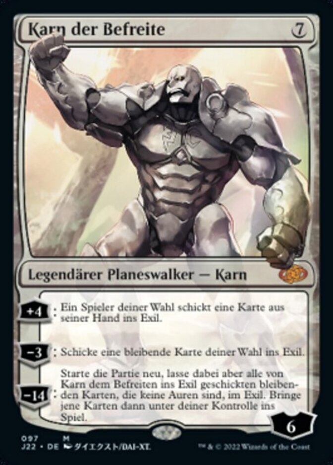 | Rules | +4: Target player exiles a card from their hand. −3: Exile target permanent. −14: Restart the game, leaving in exile all non-Aura permanent cards exiled with Karn Liberated. Then put those cards onto the battlefield under your control. |