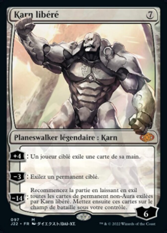 | Rules | +4: Target player exiles a card from their hand. −3: Exile target permanent. −14: Restart the game, leaving in exile all non-Aura permanent cards exiled with Karn Liberated. Then put those cards onto the battlefield under your control. |