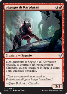 | Rules | Whenever Karplusan Hound attacks, if you control a Chandra planeswalker, this creature deals 2 damage to any target. |