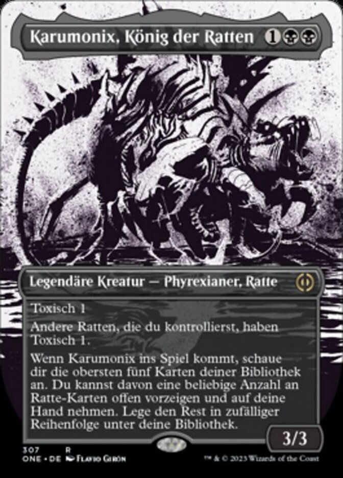 | Rules | Toxic 1 (Players dealt combat damage by this creature also get a poison counter.) Other Rats you control have toxic 1. When Karumonix enters the battlefield, look at the top five cards of your library. You may reveal any number of Rat cards from among them and put the revealed cards into your hand. Put the rest on the bottom of your library in a random order. |