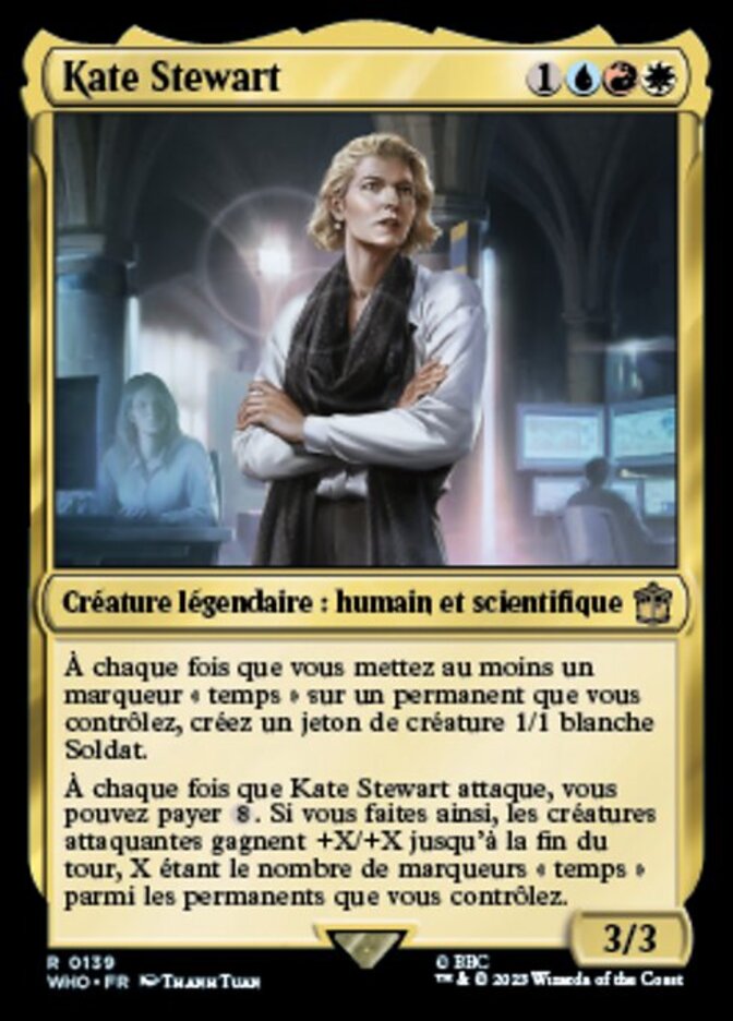 | Rules | Whenever you put one or more time counters on a permanent you control, create a 1/1 white Soldier creature token. Whenever Kate Stewart attacks, you may pay . If you do, attacking creatures get +X/+X until end of turn, where X is the number of time counters among permanents you control. |