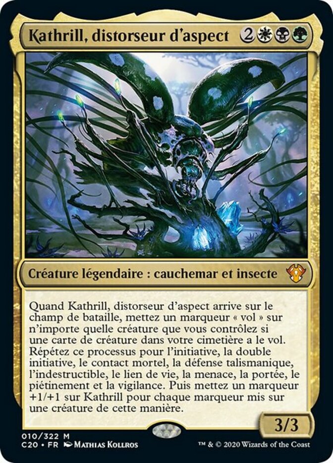 | Rules | When Kathril, Aspect Warper enters the battlefield, put a flying counter on any creature you control if a creature card in your graveyard has flying. Repeat this process for first strike, double strike, deathtouch, hexproof, indestructible, lifelink, menace, reach, trample, and vigilance. Then put a +1/+1 counter on Kathril for each counter put on a creature this way. |