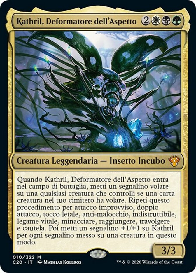 | Rules | When Kathril, Aspect Warper enters the battlefield, put a flying counter on any creature you control if a creature card in your graveyard has flying. Repeat this process for first strike, double strike, deathtouch, hexproof, indestructible, lifelink, menace, reach, trample, and vigilance. Then put a +1/+1 counter on Kathril for each counter put on a creature this way. |