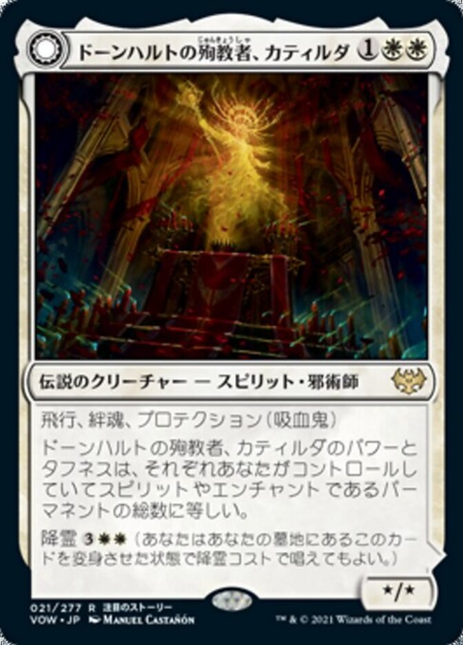 | Rules | Flying, lifelink, protection from Vampires Katilda, Dawnhart Martyr's power and toughness are each equal to the number of permanents you control that are Spirits and/or enchantments. Disturb (You may cast this card from your graveyard transformed for its disturb cost.) // Enchant creature Enchanted creature has flying, lifelink, and protection from Vampires, and it gets +X/+X, where X is the number of permanents you control that are Spirits and/or enchantments. If Katilda's Rising Dawn would be put into a graveyard from anywhere, exile it instead. |