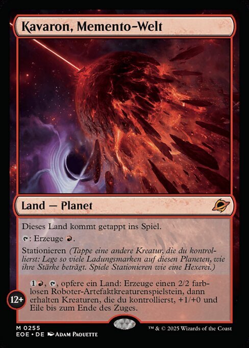 | Rules | This land enters tapped. : Add . Station (Tap another creature you control: Put charge counters equal to its power on this Planet. Station only as a sorcery.) STATION 12+ , , Sacrifice a land: Create a 2/2 colorless Robot artifact creature token, then creatures you control get +1/+0 and gain haste until end of turn. |