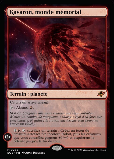 | Rules | This land enters tapped. : Add . Station (Tap another creature you control: Put charge counters equal to its power on this Planet. Station only as a sorcery.) STATION 12+ , , Sacrifice a land: Create a 2/2 colorless Robot artifact creature token, then creatures you control get +1/+0 and gain haste until end of turn. |