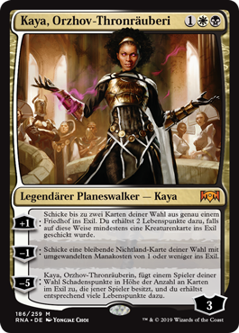 | Rules | +1: Exile up to two target cards from a single graveyard. You gain 2 life if at least one creature card was exiled this way. −1: Exile target nonland permanent with mana value 1 or less. −5: Kaya, Orzhov Usurper deals damage to target player equal to the number of cards that player owns in exile and you gain that much life. |