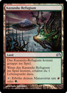 | Rules | Kazandu Refuge enters the battlefield tapped. When Kazandu Refuge enters the battlefield, you gain 1 life. : Add or . |