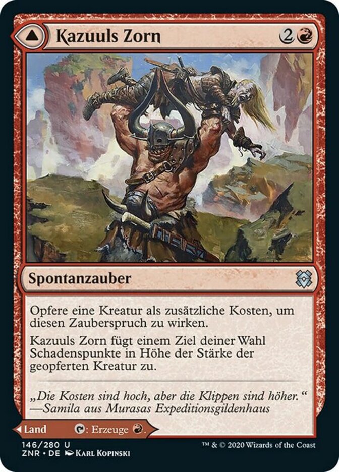 | Rules | As an additional cost to cast this spell, sacrifice a creature. Kazuul's Fury deals damage equal to the sacrificed creature's power to any target. // Kazuul's Cliffs enters the battlefield tapped. : Add . |