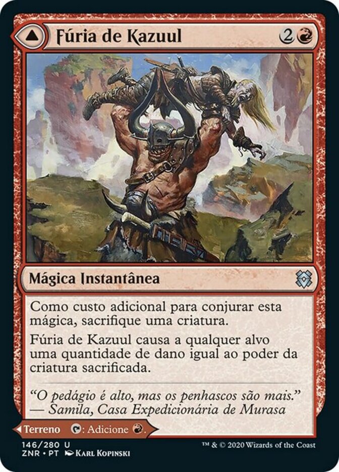 | Rules | As an additional cost to cast this spell, sacrifice a creature. Kazuul's Fury deals damage equal to the sacrificed creature's power to any target. // Kazuul's Cliffs enters the battlefield tapped. : Add . |