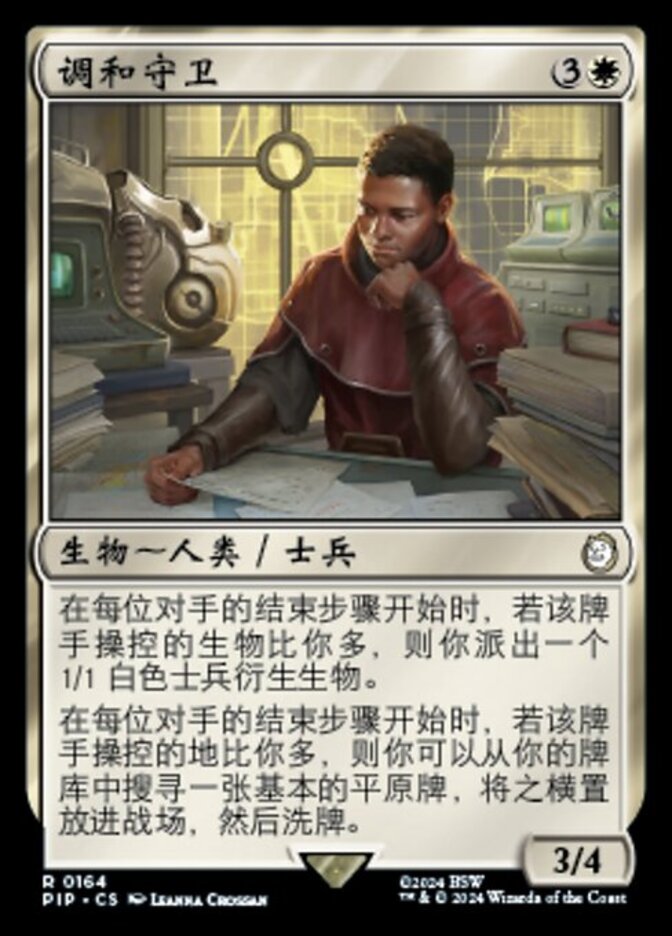| Rules | At the beginning of each opponent's end step, if that player controls more creatures than you, create a 1/1 white Soldier creature token. At the beginning of each opponent's end step, if that player controls more lands than you, you may search your library for a basic Plains card, put it onto the battlefield tapped, then shuffle. |