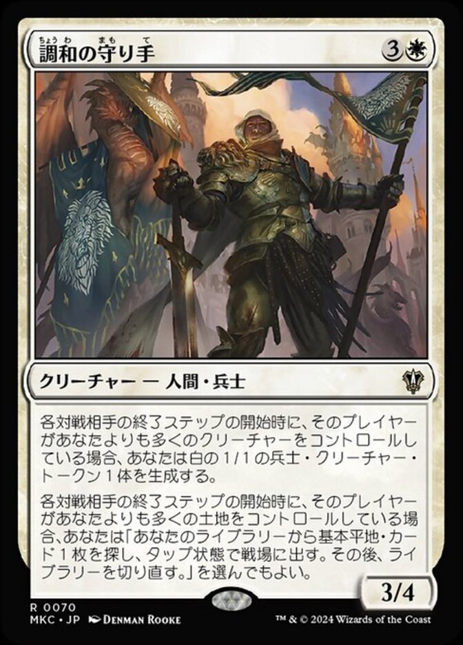 | Rules | At the beginning of each opponent's end step, if that player controls more creatures than you, create a 1/1 white Soldier creature token. At the beginning of each opponent's end step, if that player controls more lands than you, you may search your library for a basic Plains card, put it onto the battlefield tapped, then shuffle. |