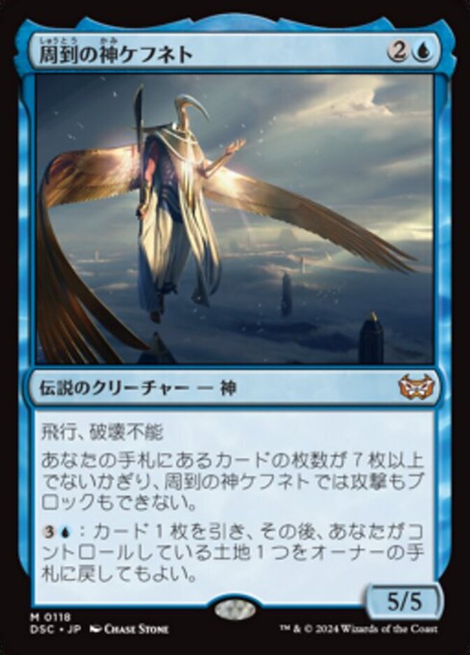 | Rules | Flying, indestructible Kefnet the Mindful can't attack or block unless you have seven or more cards in hand. : Draw a card, then you may return a land you control to its owner's hand. |