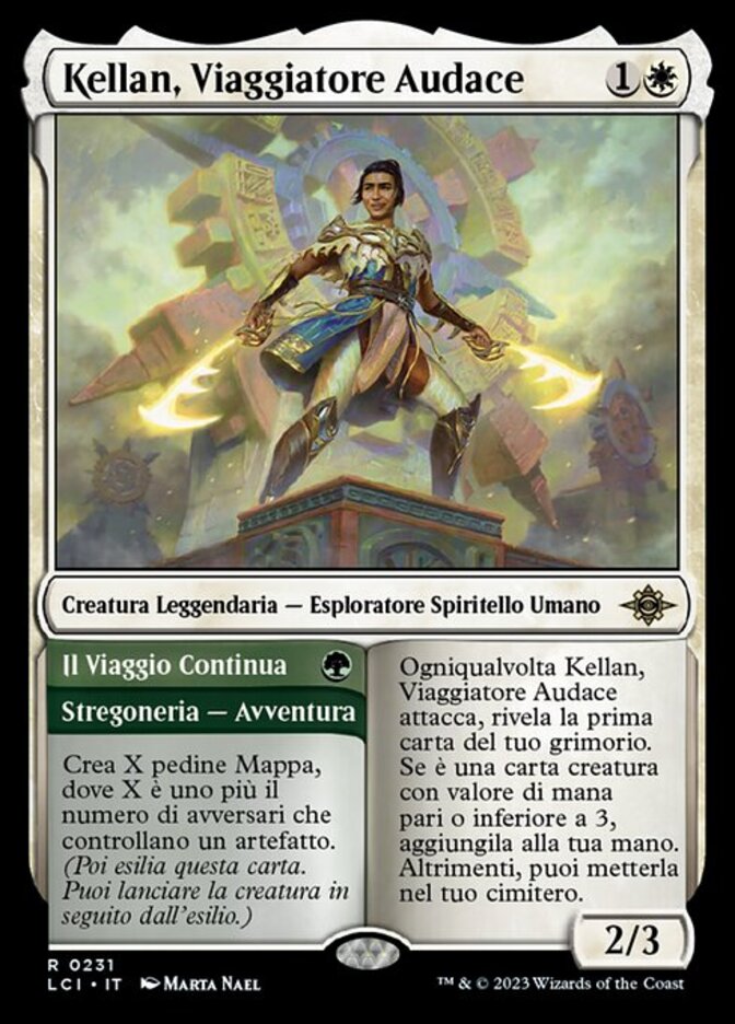 | Rules | Whenever Kellan, Daring Traveler attacks, reveal the top card of your library. If it's a creature card with mana value 3 or less, put it into your hand. Otherwise, you may put it into your graveyard. // Create X Map tokens, where X is one plus the number of opponents who control an artifact. (Then exile this card. You may cast the creature later from exile.) |
