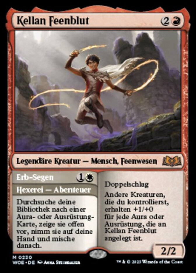 | Rules | Double strike Other creatures you control get +1/+0 for each Aura and Equipment attached to Kellan, the Fae-Blooded. // Search your library for an Aura or Equipment card, reveal it, put it into your hand, then shuffle. |